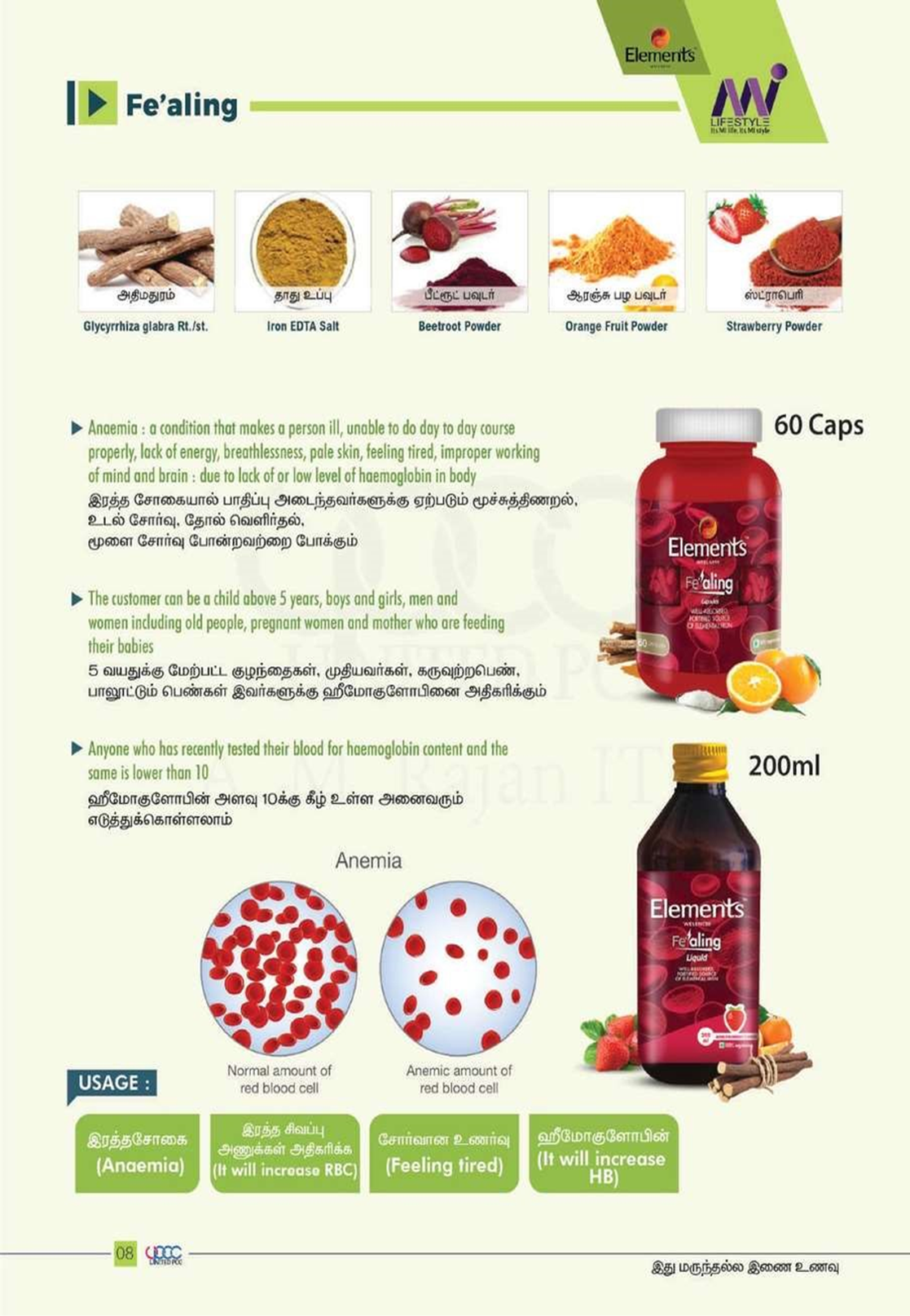 EW Fe’aling is made with a block buster novel ingredient that is rich in iron and in a form which is highly absorbed named “Ferrazone”. This ferrazone in the product does not get bound to any of the food ingredients and has a relative absorption of above 90% compared to other iron salts. In one serving size of this food supplement product, one gets 33% of daily requirements of iron assuming that the rest of the iron the person gets from the food and juices they consume daily. In addition EW Fe’aling contains glycine-an important amino acid which is a building block of life that provides energy and also promotes absorption of iron. In addition EW Fe’aling is enriched with herbs known in Ayurveda, namely Mulethi and beetroot for additional support.