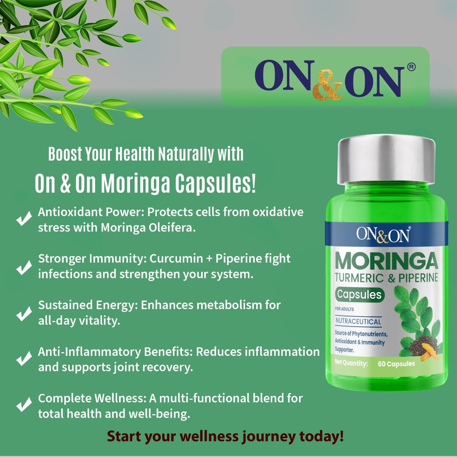 On & On Moringa, Turmeric & Piperine Capsules offer a potent blend of natural ingredients designed to support vitality and overall wellness. These capsules combine the nutrient-dense Moringa, rich in phytonutrients and antioxidants that combat free radicals and support cellular health, with Turmeric’s renowned anti-inflammatory and immune-boosting properties. Enhanced with Piperine to maximize nutrient absorption, this powerful formula is designed exclusively for adults. It offers a convenient way to strengthen your immune system and maintain optimal health. Choose this nature-inspired supplement for a healthier, more vibrant life.