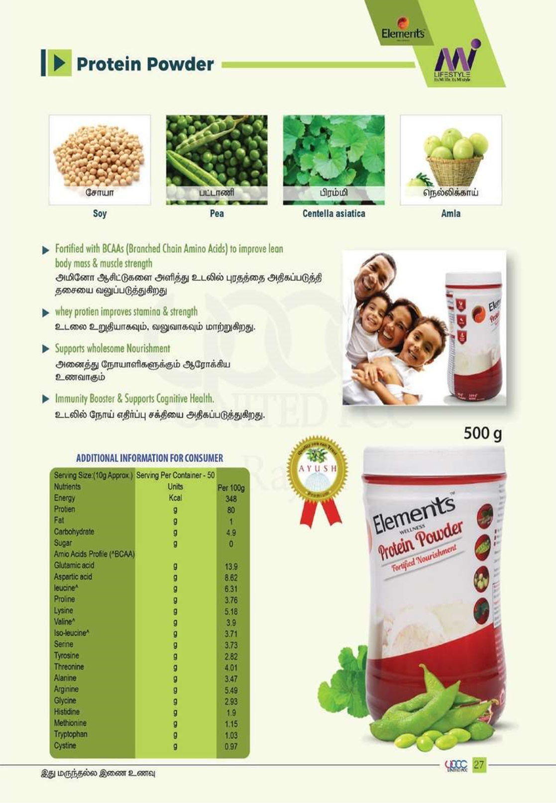 Elements Protein powder is a proprietary Ayurvedic blend of Soy, Pea & Whey Protein added with goodness of Amla & Brahmi. Protein has an essential role in supporting body’s growth & meeting energy requirements. One serve of Elements Protein powder (10g) provides 80% protein.